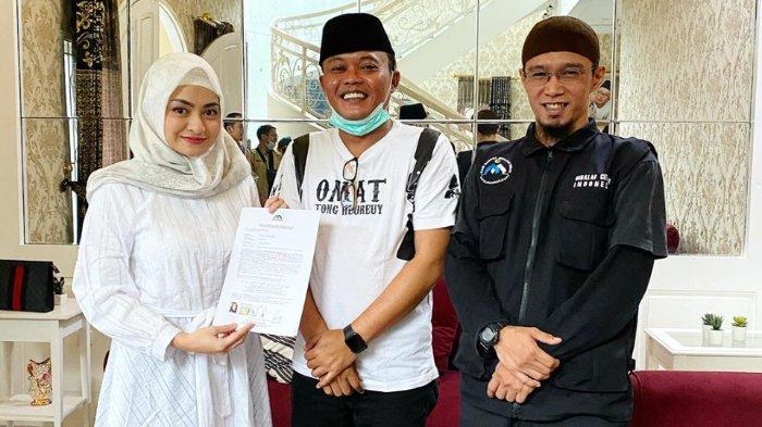 Nampak Nathalie berdiri di samping Sule, seraya memegang surat keterangan memeluk Islam dan menjadi mualaf.