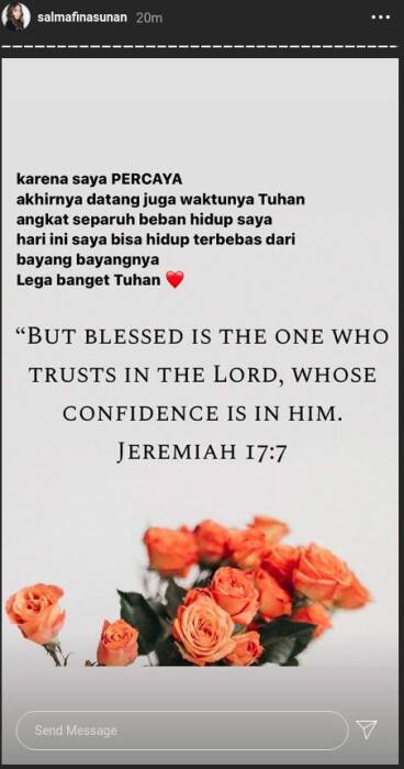 “Karena saya saya PERCAYA akhirnya datang juga waktunya Tuhan angkat separuh beban hidup saya. Hari ini saya bisa hidup terbebas dari bayang-bayangnya. Lega banget Tuhan,” tulis Salma.