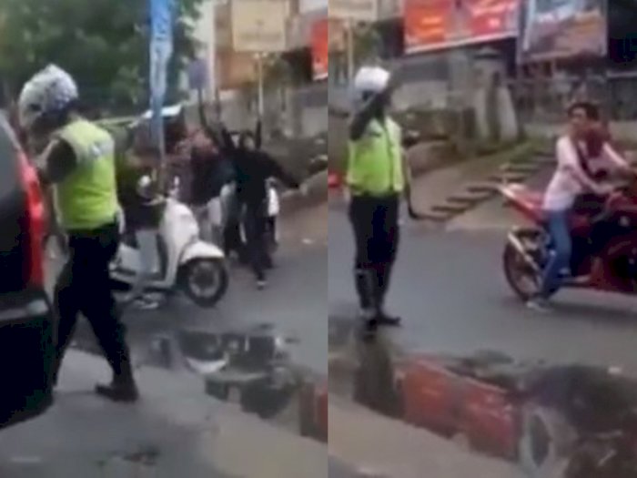 Mereka terlihat mengejar polisi itu, sementara si polisi yang sendirian itu tampak menepi dan menghindari mereka.