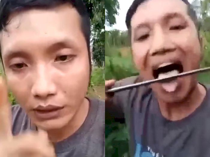 Setelah selesai berbicara dan mengajak duel, pria yang belakangan diketahui bernama Awang itu lantas menebas batang singkong dengan golok yang dipegangnya. Lantas, dia mamakerkan kekebalan tubuhnya dengan mencoba mengiriskan golok itu ke pipi, leher, tangan, perut, dan bahkan lidah.