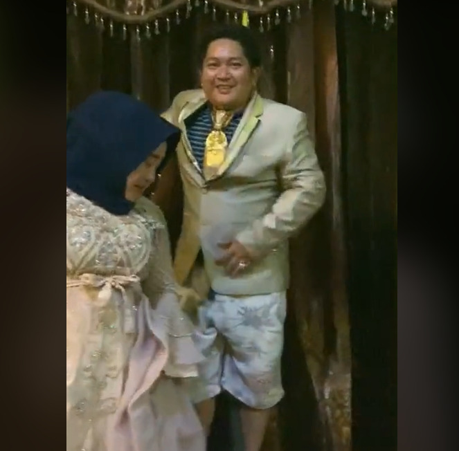 Dalam video terlihat pria mengenakan jas berwarna cokelat, begitu juga dengan wanita nampak mengenakan gaun dengan warna senada. Sang suami berdiri di belakang istrinya dan keduanya siap menghadap kamera.